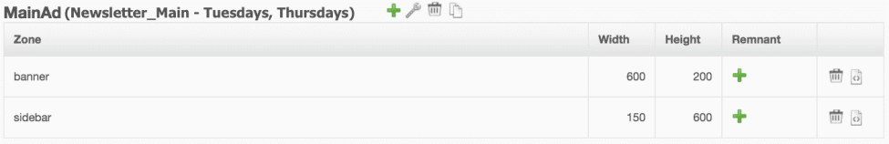 • In the example below two ad zones have been created: banner and sidebar. The height and width of each correspond to the ad space coded into the chosen template. When coding a template, you'll want to be specific about the image size for each zone.