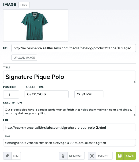 "Position" is an editable field allowing you to change the position of the item within the feed. Changing this number has the same effect as dragging and dropping the item in the main feed view. To replace the current image or add an image, if none is present, click Upload Image. The image file is added to your Image Library and the image URL field is automatically populated with the new media.sailthru.com URL. If any additional fields are present in the feed or you want to add others, they can be accessed below the primary fields by clicking the Show Custom Fields button.