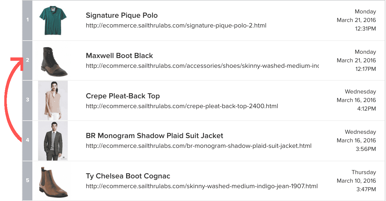To reorder the feed, click and hold any feed item, drag it to the desired position and then release (drop) the item. The preview pane will update in real time, although your template may not be configured to display items in the same order as they appear in the feed. Note: When the feed is filtered, you cannot drag and drop a content item to change its position. Instead, you can manually edit its position number.