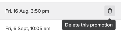 Find the promotion you wish to delete and hover over the row. A delete icon will show at the end of the row.