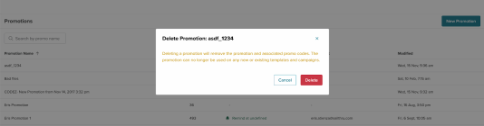 Click the icon. A delete promotion modal opens. Select Delete to permanently delete the entry and the associated promotion codes.
