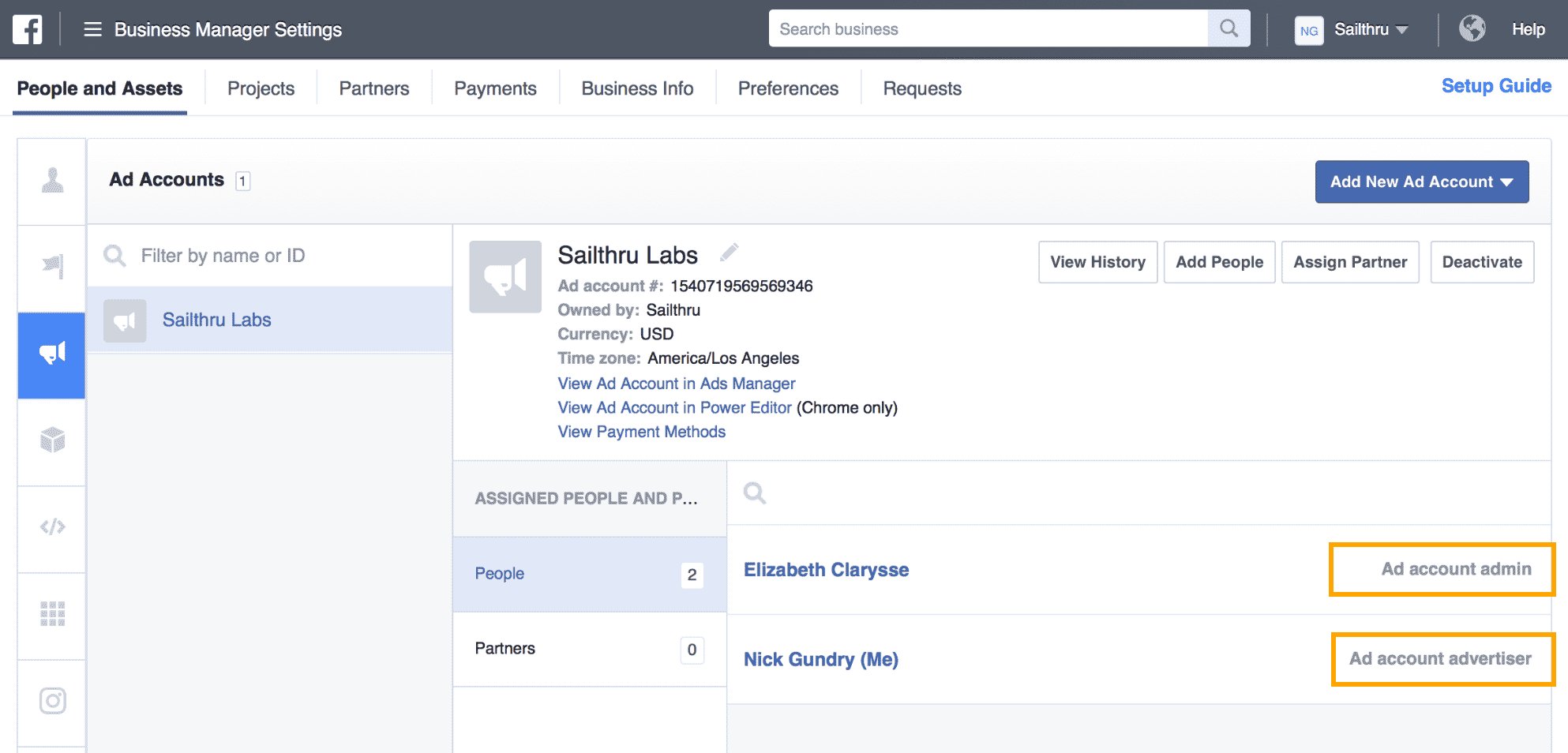 • In the Facebook Business Manager Ad Accounts section, with the ad account name selected, users and their permissions are listed in the Assigned People and Partners section. Confirm that the user is an Admin or Advertiser.