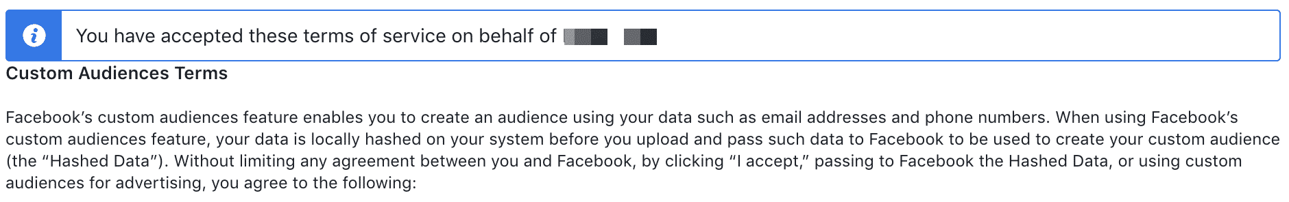 Note: Facebook requires that users agree to the corporate Terms of Service for Custom Audiences. Each advertiser/admin may be prompted to do this the first time they create a Custom Audience. While you may have already agreed to similar terms on a personal Facebook account, this may need to be completed again under Business Manager.