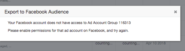 If you have previously set up the connection between Sailthru and Facebook Custom Audiences, but now are receiving a "Your Facebook account does not have access to the Ad Account Group" error. This is a generic message and is not always an indicator of the real issue.