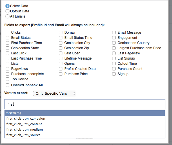 Step 1: Run a job export from your account on the lists you want to export. You can select "Select Data" and input which custom vars to include in the export.