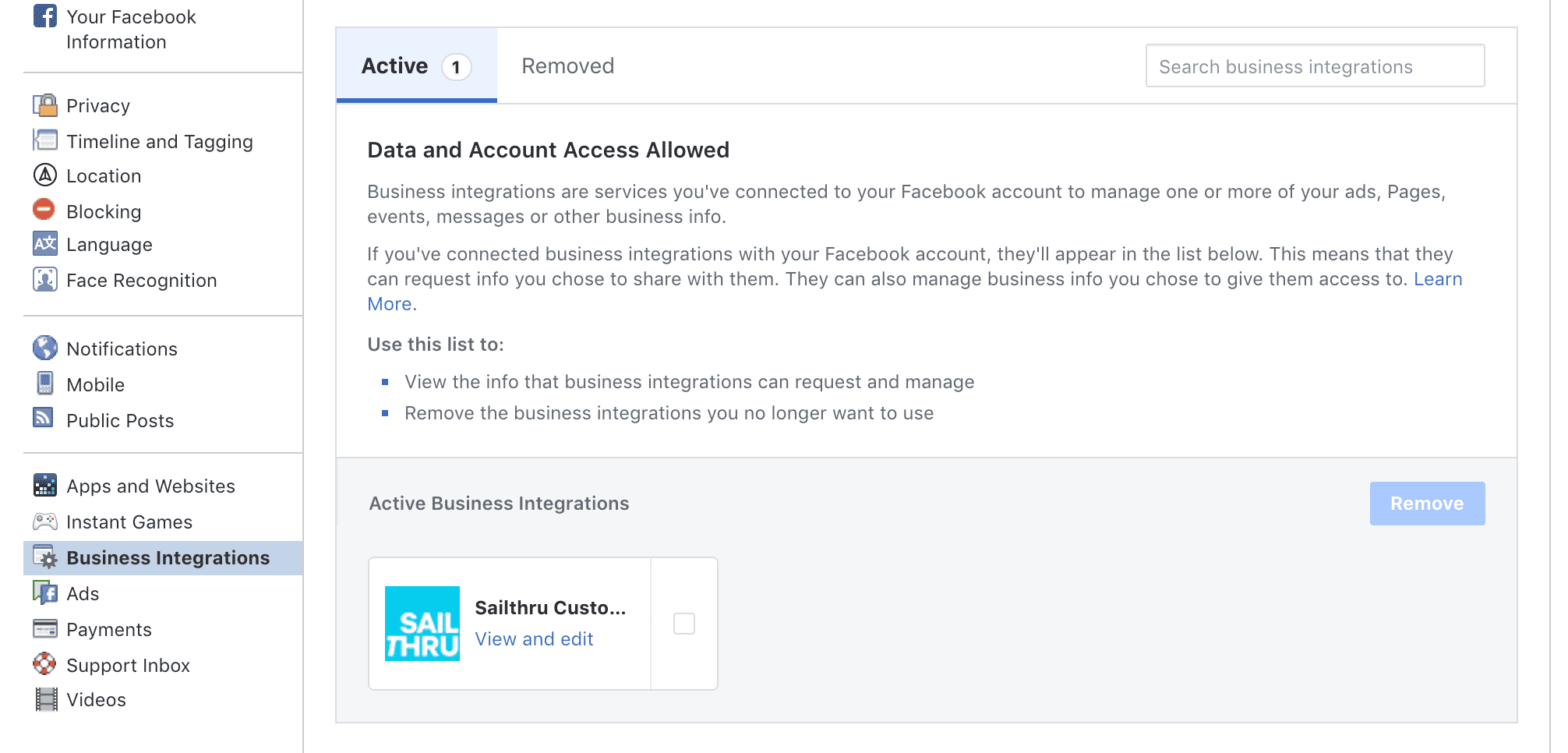 If you no longer need to permission Sailthru to your ads account to audiences to Facebook, or you need to reset the access, you can remove the app access by following the steps on Facebook.