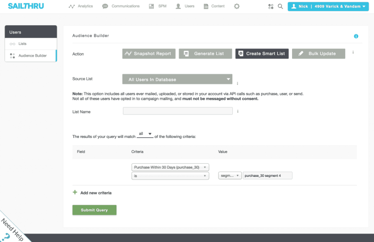 Once you’ve saved the smart list, go to the Lists page at my.sailthru.com and export it to Facebook by clicking the cloud icon and choosing Facebook Custom Audiences.