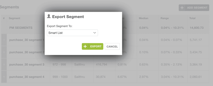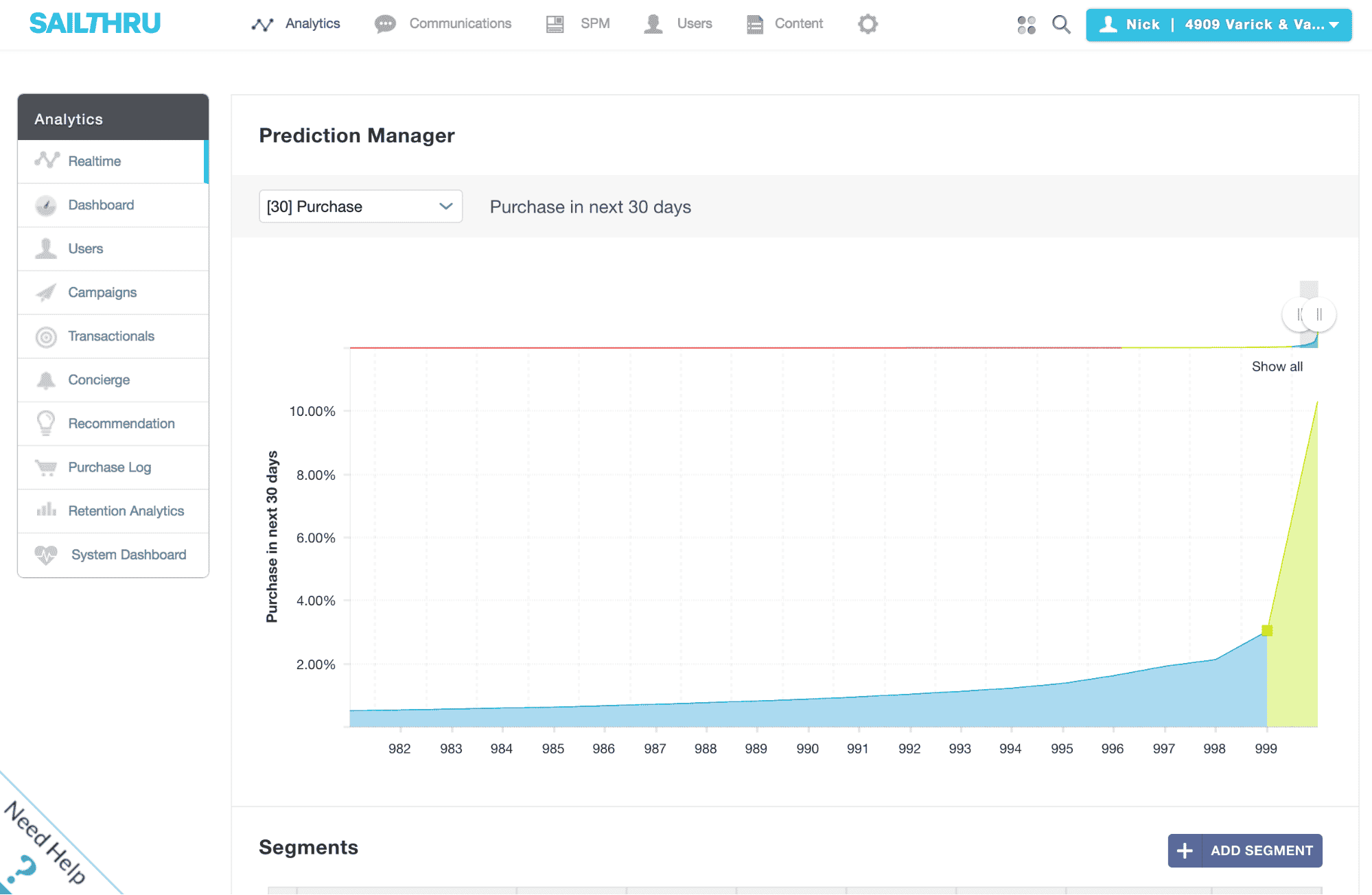 To easily identify existing users who mean the most to your business, use the Predictions interface at my.sailthru.com. You’ll find a number of pre-generated customer segments that will be useful for Facebook Custom Audiences, or you can create your own.