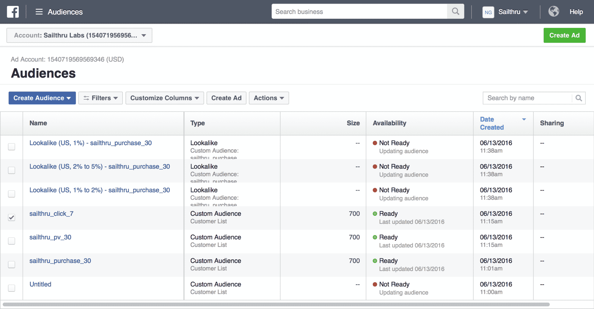 When naming the audience (as it will be displayed in Facebook), choose a name that will allow you to identify it as being sourced from the segment you used. For example “sailthru_click_7” or “sailthru_purchase_30”. This will allow you to quickly see which audiences have come from Sailthru and create lookalikes.