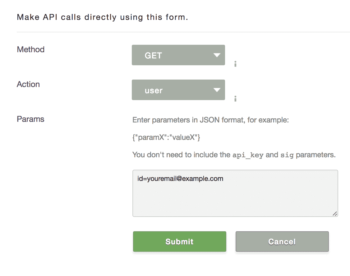 Log in to your account at my.sailthru.com, click the settings icon, and click API Test. Then make a GET request for the user API endpoint, specifying a test email address. If the test user does not yet exist, you can make an identical POST request first.