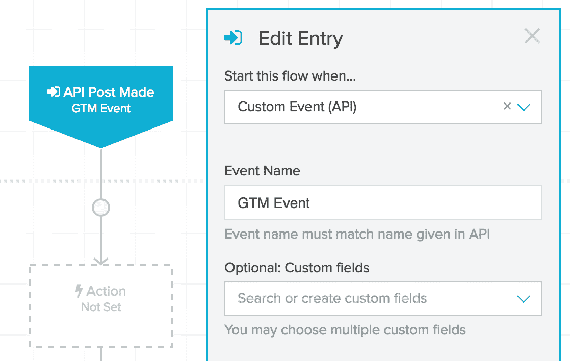 In Lifecycle Optimizer, you need to create a new flow and set it to start whenever an event named GTM Event is submitted.
