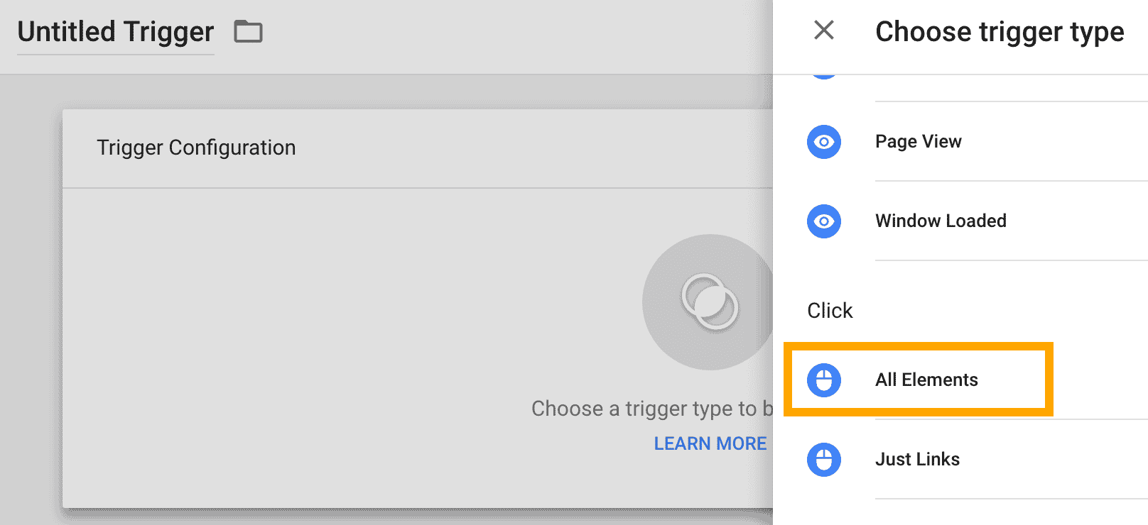 - Click the Trigger Configuration box, then select the trigger type All Elements.