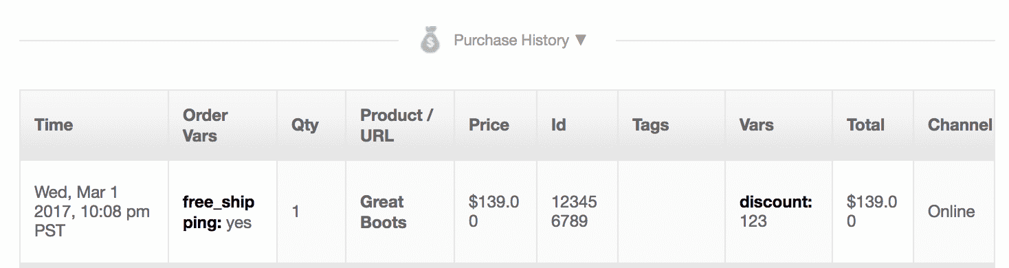 Once the cookie exists in your browser, open your test site and click the Complete Purchase button. Then, in My Sailthru, open the test user profile (by searching for the email address in the top-right field) and you will see the example product in the “Purchase History.” Also, if you had previously tested adding this item to the cart, it will no longer appear in the “Incomplete Purchase Cart” section.