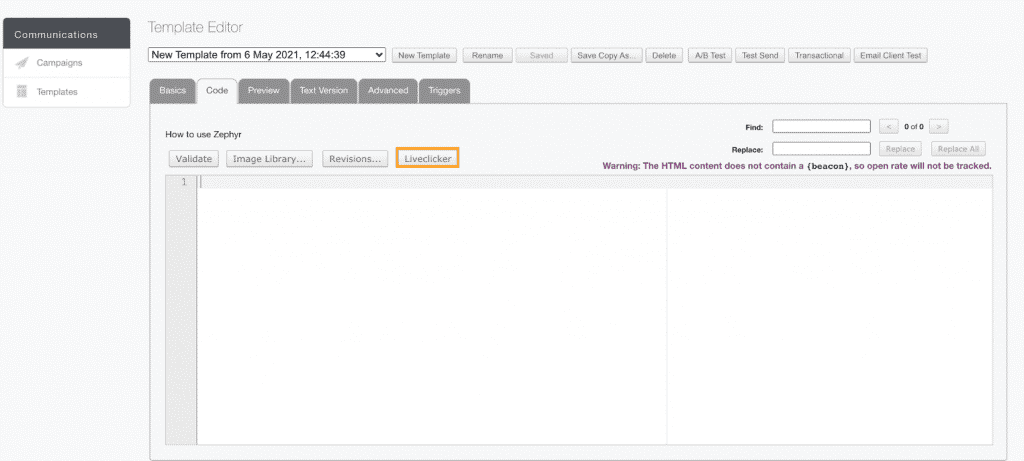 - In the Code tab, click on the Liveclicker button.