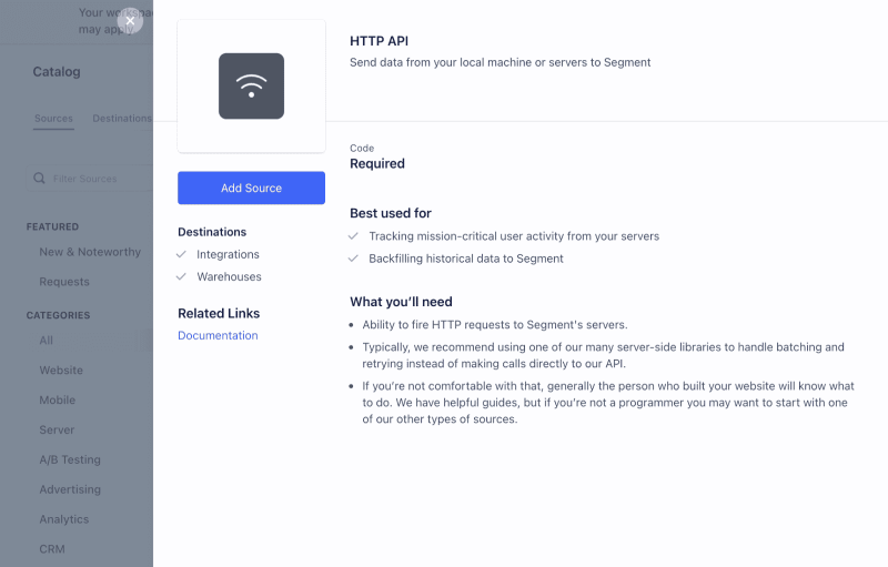 To use the Segment Source, you must create an HTTP API Source in your Segment account. You can use this link as a shortcut.