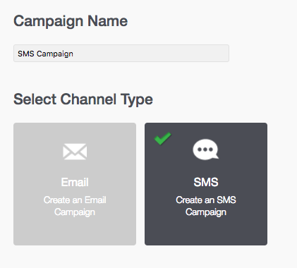 Sending an SMS campaign is very similar to sending an email campaign. To get started with an SMS campaign, navigate to Communications > New Campaign, then choose the SMS channel type and name your campaign.