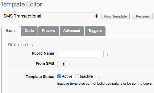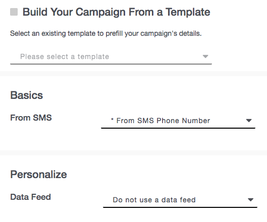 Click Save & Continue to proceed to the configuration screen.The configuration screen will allow you to choose a template. SMS messages are limited to 160 characters so most users do not use a template here, but you might use one if you have some basic info you always include.Under Basics, choose the number that the SMS will be sent from. This is the number Beepsend has provided you. Remember we'll need to add this account, so if you don't see your number in the drop down reach out to your Account Manager or Support.