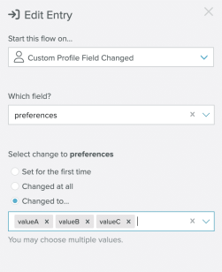 append_user_var()Zephyr function. - A flow is eligible to start if the custom field is changed via Hosted Pages, LO actions, User API calls, User Profile pages, and Zephyr.