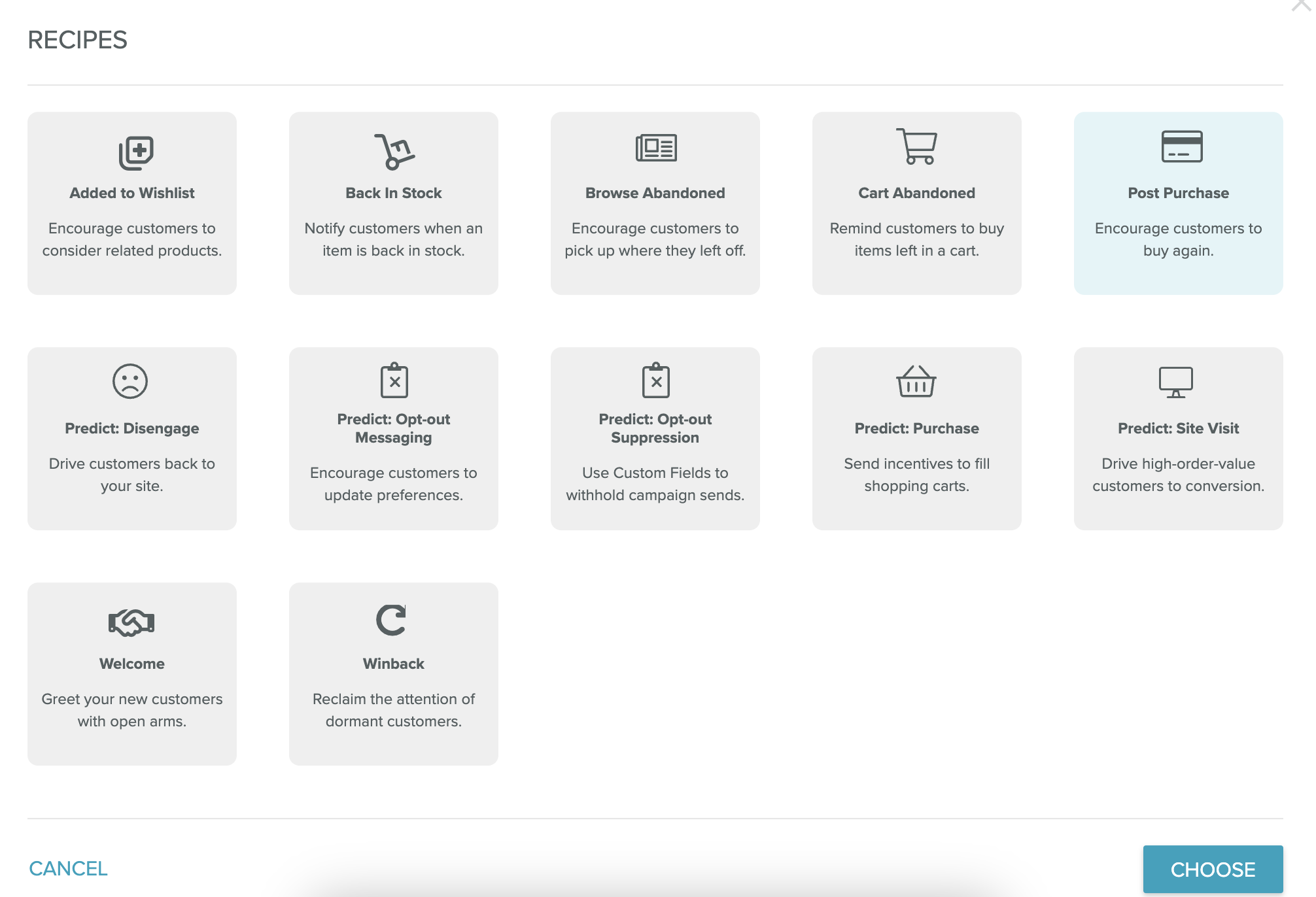 Lifecycle Optimizerprovides a gallery of commonly-built flows to get your started. From a simple welcome flow to more complex options that require Predictions or the Content Triggers API, there's a recipe available.