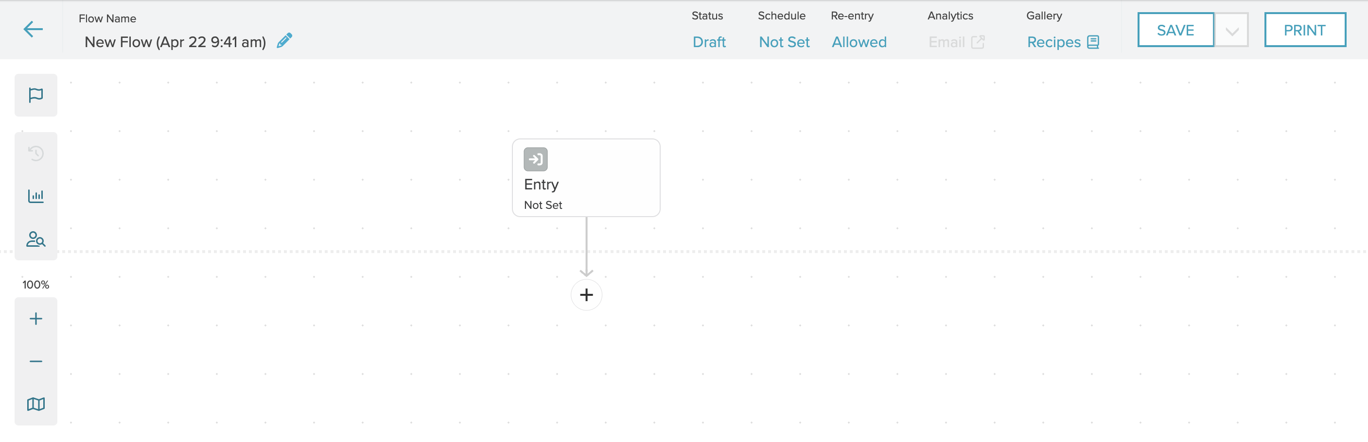 From the Flow List page, select a flow from the list to edit it or select the New Flow button to open the Builder. When you create a new flow, the Builder opens with an unconfigured Entry step on the canvas.