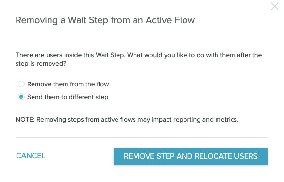 - Delete the step and relocate waiting users to another step. The users within the Wait step will observe the original wait time you set before moving to the selected relocation step.