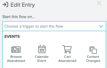 - Select the unconfigured Entry step to open the Edit Entry panel. Select an Entry from the panel. Entries are organized into categories: Events, Email, Mobile, Users, and Predictions (if Predictions are enabled on your account).