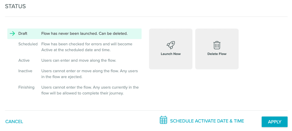 The flow status allows you to manage when your flow should be used. Select Status from the top menu bar. From the Status modal, you can immediately launch your flow or schedule a date and time for it to launch.