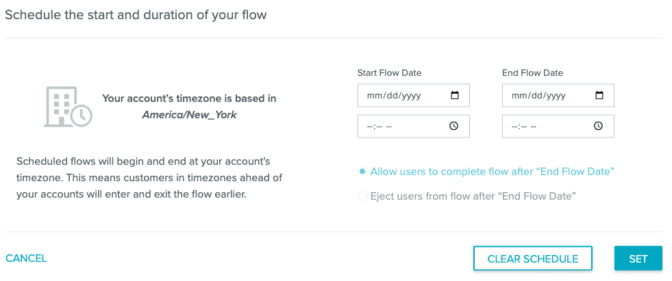 - Select a way to handle subscribers still in the flow on the end date. You can allow them to complete the flow or you can eject all subscribers from the flow once it ends.