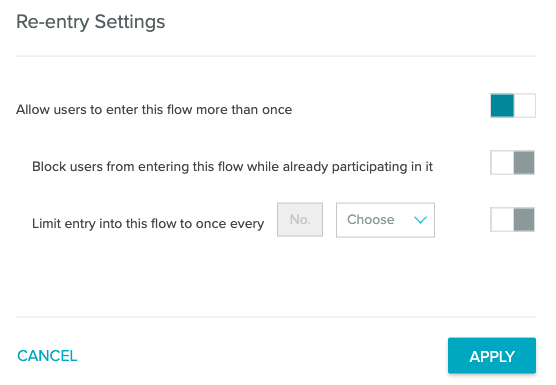 You can restrict users' entries into a flow using the flow's "Re-entry" settings. This allows you to restrict, or cap, the frequency that a user may participate in a given flow when it's active. Note: Flow re-entry is only supported for two years. After two years, a user will enter and move through the flow like a new user. The Builder toolbar displays a flow's re-entry status. Click on the status to open the configuration panel.