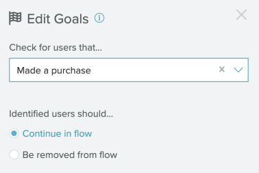 - For either Goal, you must decide what should happen once a user completes the goal. Identified users can continue in the flow or be removed from it.
