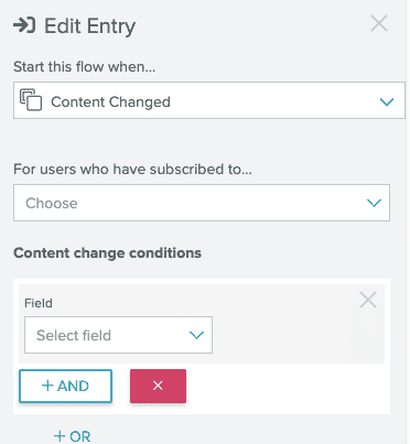 The Content Changed entry in Lifecycle Optimizer initiates a flow when the content for an item reflects the conditions you set.