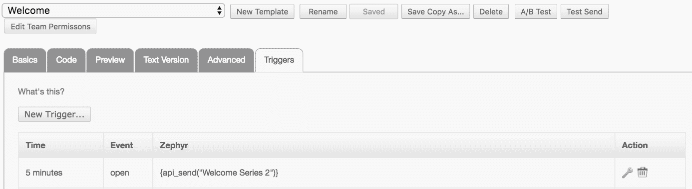 - Action - What action the trigger should take. Options include: send follow up email, add subscriber to another list, or execute a custom Zephyr script.