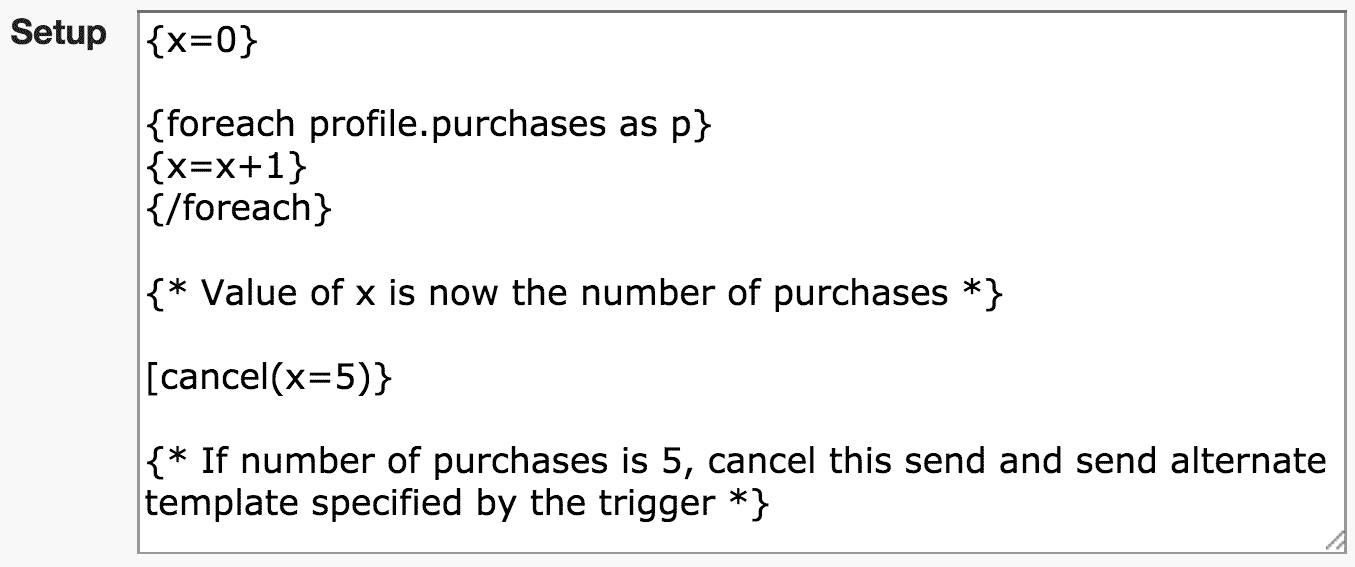 Consider the case of a client who wishes to send Receipt Template A, except in the case of a user's fifth purchase, in which case a different receipt template should be sent including a 50% discount coupon (Receipt Template B).
