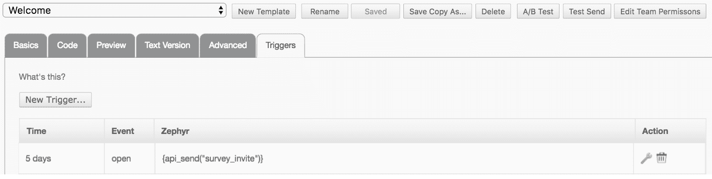 Below, the trigger will be executed (survey_invite template will be sent) 5 days after the user opens the original triggered email (welcome template).