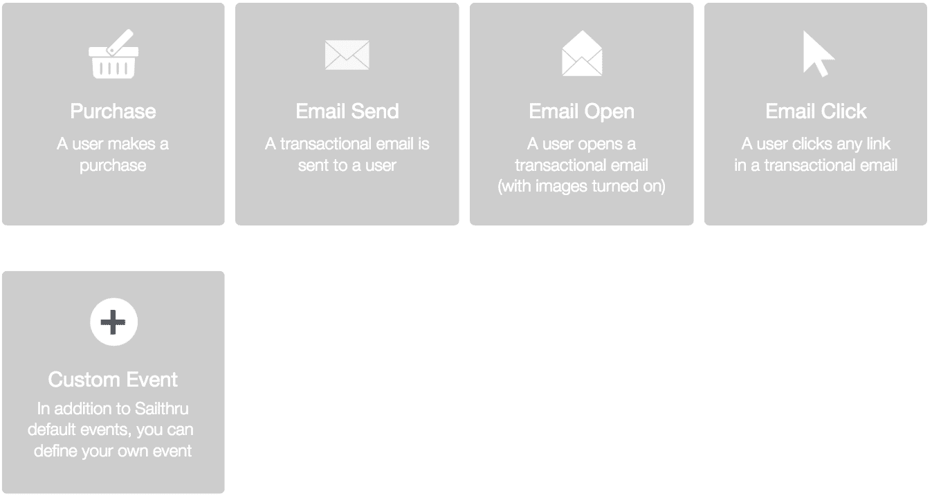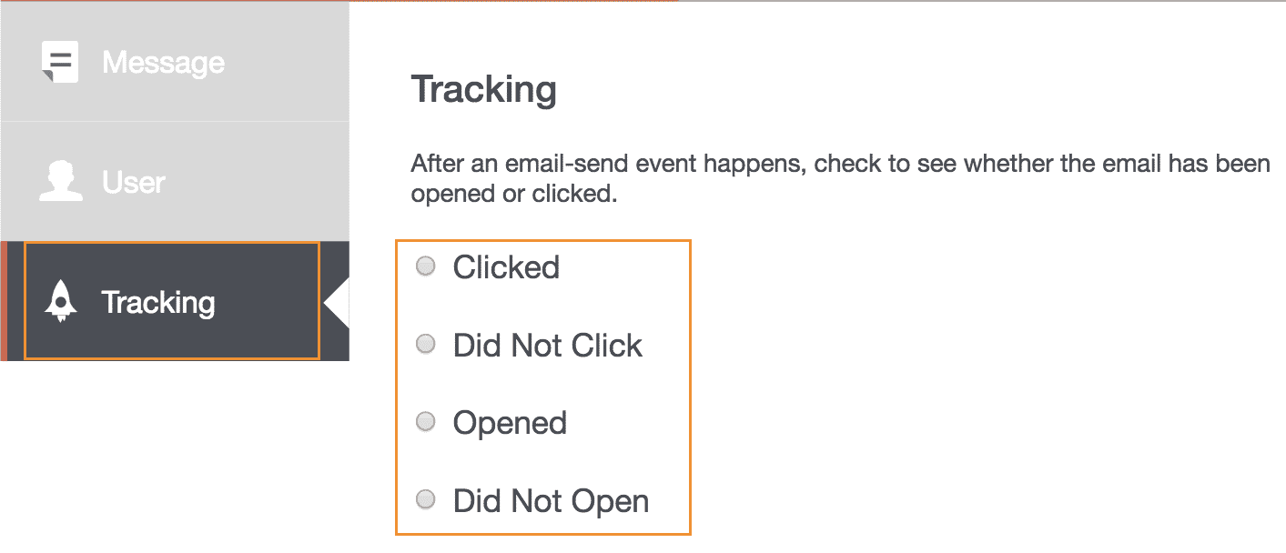 There are different types of Criteria, depending on what starting Event is selected. For example, you can set Criteria against the "Message", "User" or "Tracking." For Custom Events, please see the Custom Event Criteria section below.