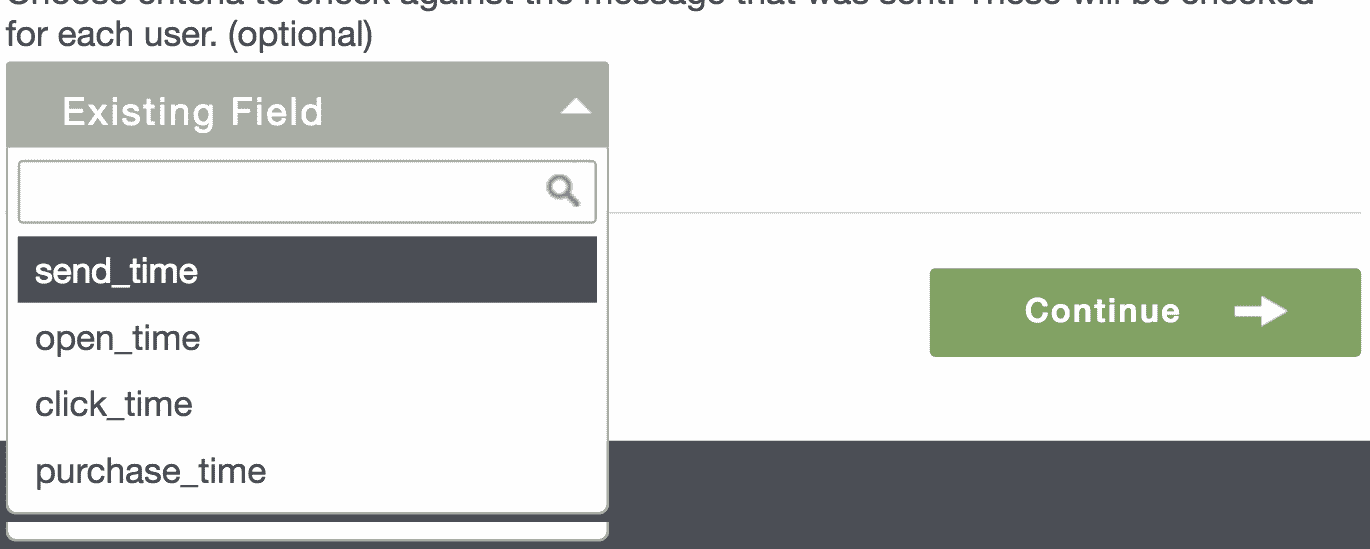 - Next, select additional criteria on the message (optional). If you selected Email Click as your starting event, this allows you to specify a time range for that event i.e. click_time is before 1 day ago.