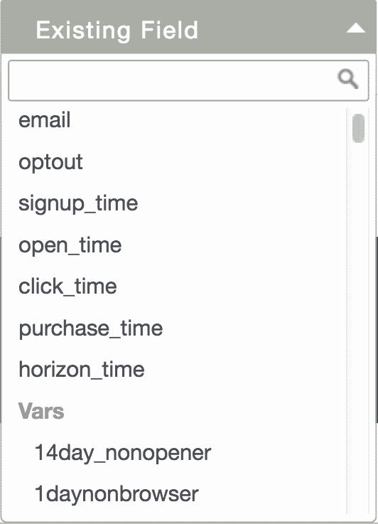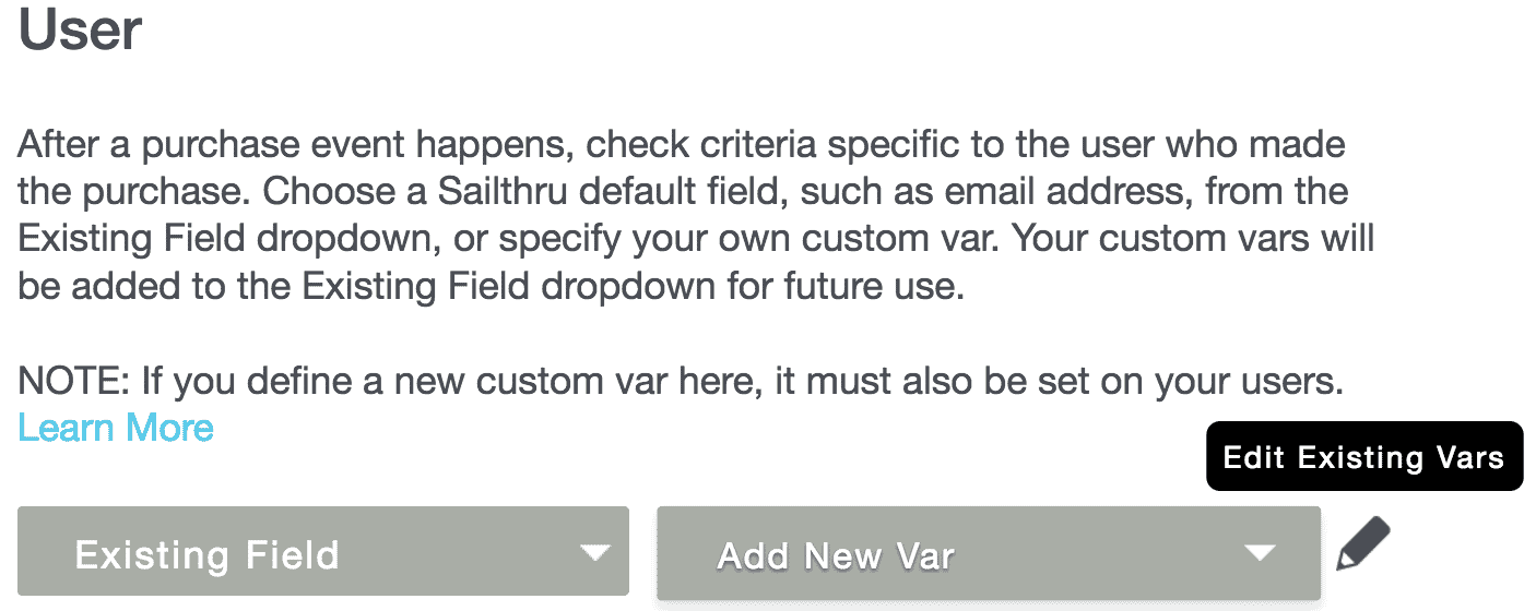 User allows you to select two types of Existing Fields: profile parameters OR variables. User criteria is also available on Custom Events.- Profile parameters are set by the platform and cannot be modified. They include: