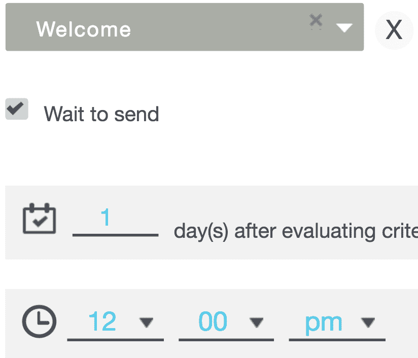 Wait Time (Optional) - After the event (e.g. purchase or email click) occurs, then the criteria parameters are checked against. Before the criteria is checked, you can set a wait time or check the criteria immediately after the event by selecting No wait time. For example, a purchase is made. Then wait 2 days before checking if the user or event matches the criteria for the follow-up action.