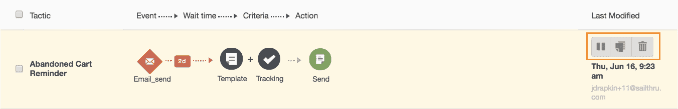For example: "signup_time is before 30 days ago" means that the user signed up more than 30 days ago. Variables must be set with these steps: Variables must match exactly for the tactic to be executed. This includes field value AND type. If you wish to edit an existing variable's name or type, please click the Pencil icon. Tracking is used for "did not" or lack of action. For example, when a user does not click an email. Use Tracking when starting with the Email Send event. This is not available on a Custom Event. Custom Events have the additional Criteria of an Event Var. An Event Var is not set on the user. It is set on the event. This only needs to be configured if Custom Event was selected as the triggering Condition. If you had selected Custom Event as your Condition, you'll need to make an API call to the event function, whenever you want to trigger that Custom Event and run the Tactic for each user. For example, let's trigger a Custom Event with the Code name "New_signup" for the user with the e-mail address "hello@example.com". You'll need to specify two parameters to make this API call: If your Smart Strategy is no longer active, you can either Pause, Copy or b the Smart Strategy. To view these options, hover over the Smart Strategy you want to change.