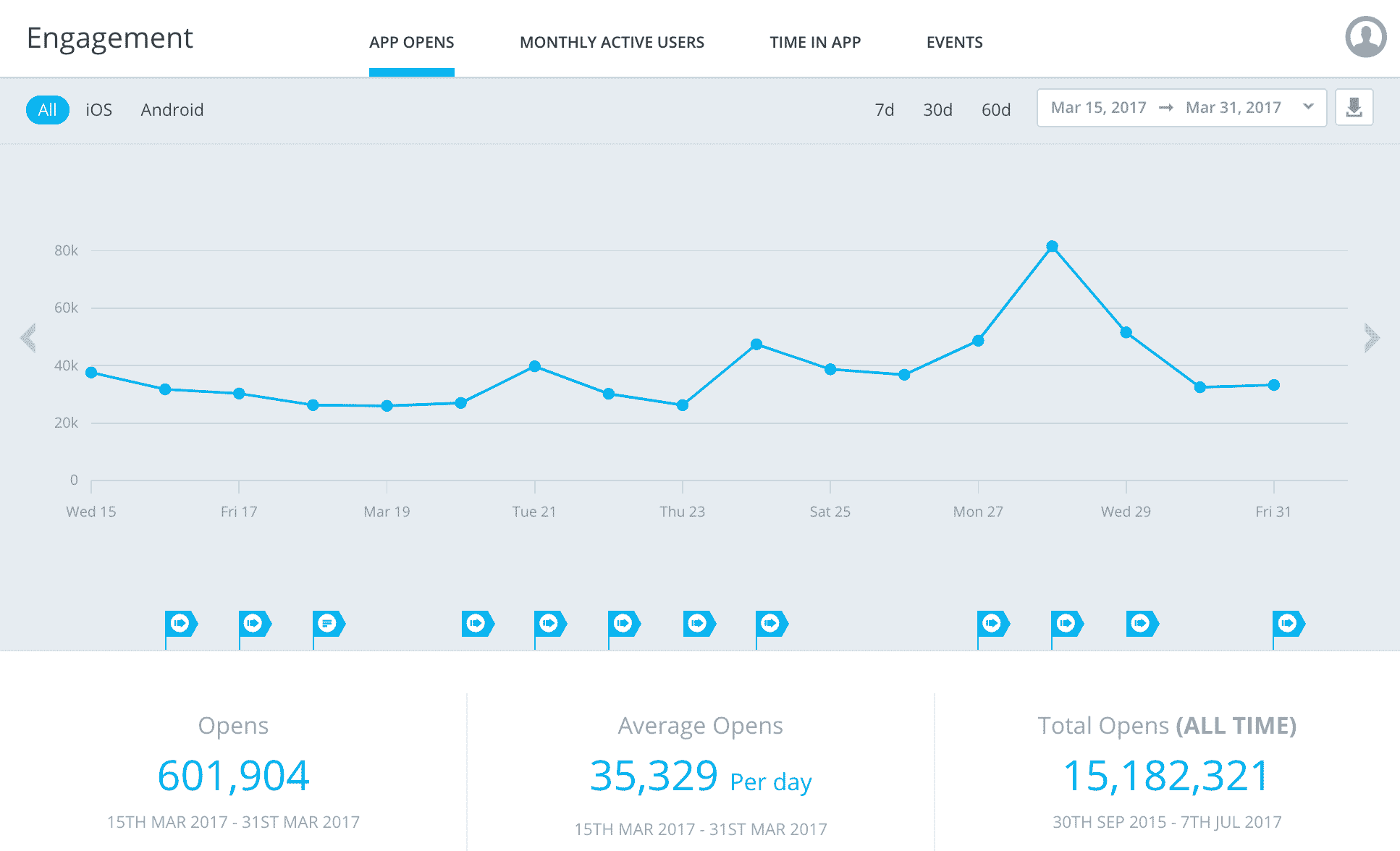 - The flags shown at the bottom of your report graphs indicate the content of each push notification or in app message correlated to the time it was sent, as well as any custom comments you have entered in this interface as internal notes. These help to relate the impact of your mobile messages and other factors (that you add as notes) on engagement.