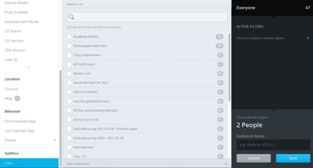 Creating audiences based on user behaviors is a helpful to make messages specifically relevant to past actions of the user. For example, you can create an audience based on Last Opened App to regularly message with incentives, such as a sales or breaking news, to prompt these users to open the app.