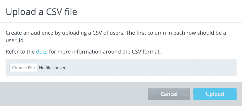 Note: To take advantage of the option to create an audience by uploading a CSV, the CSV must include a User ID. As a best practice, always set up apps to pass a User ID. If the user_id does not exist in your app, it will not appear in the audience.