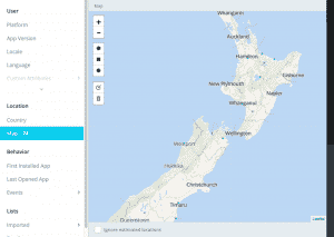 The Location interface allows you to filter your Audience based on where your users are. You can target by Country or set specific areas on the Map tab.
