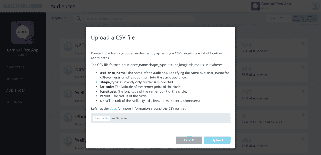 Upload a single CSV file to create multiple geofenced audiences at once and group multiple locations into a single audience. The file must be in the following format withaudience_name as the first column: audience_name,shape_type,latitude,longitude,radius,unit- audience_name: The name of the audience. Specifying the same audience_name for different entries will group them into the same audience