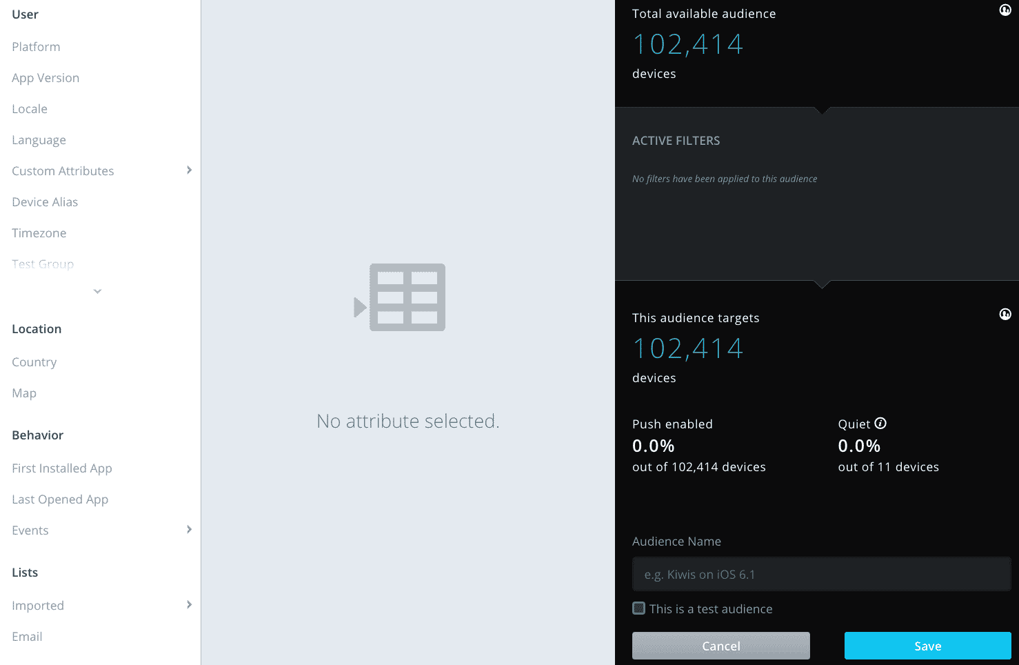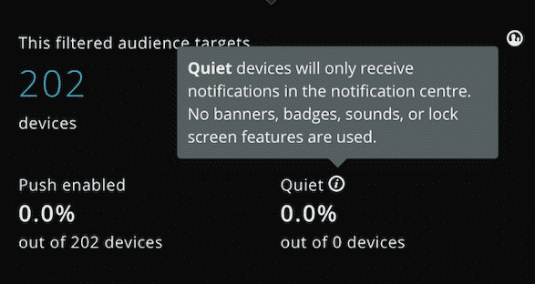Also listed here will be the total number of users in the audience based on the filters you've chosen. The total number of users shows how many users are Push Enabled, and of the enabled users, how many are set to Quiet.
