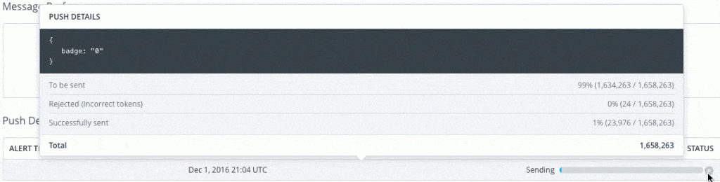 Once the push has been processed and is ready to be sent, the state will change to Sending. A progress bar will appear to display the current progress within the audience (in other words, how many pushes have been sent so far).